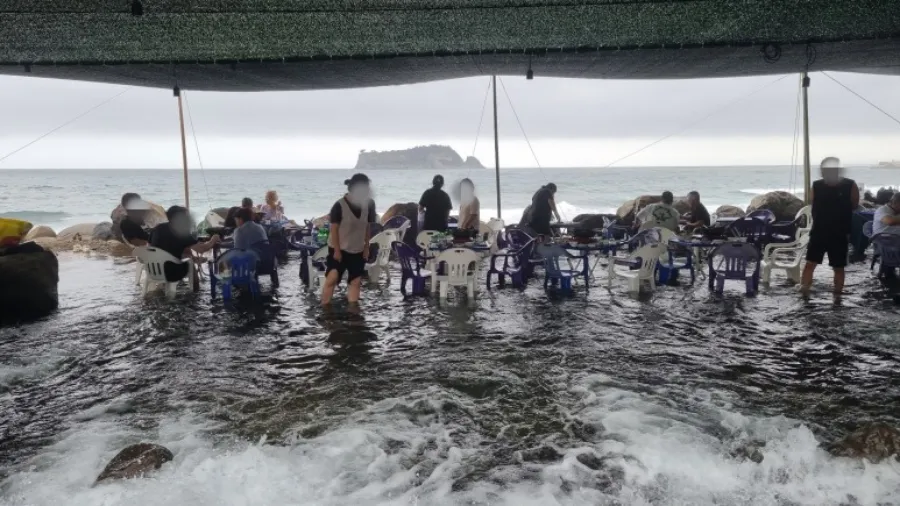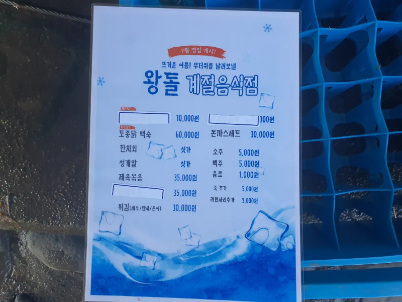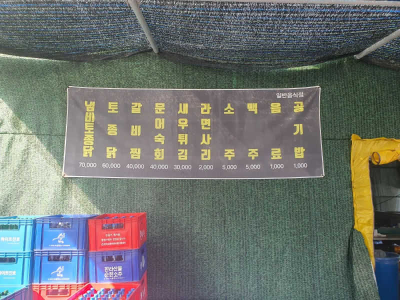 작년에는 평상을 펴놓고 영업을 하였는데 지금은 장마철이 길어지고 있어 테이블로 대체해서 영업 중입니다.